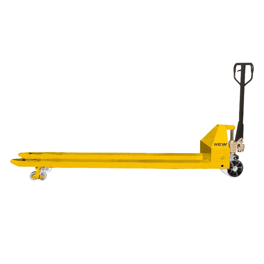 2 metre uzun çatal yapısına sahip manuel transpalet, 3.5 ton taşıma kapasitesiyle mobilya, boru ve profil gibi uzun ve ağır yüklerin güvenli taşınması için ideal çözümdür.