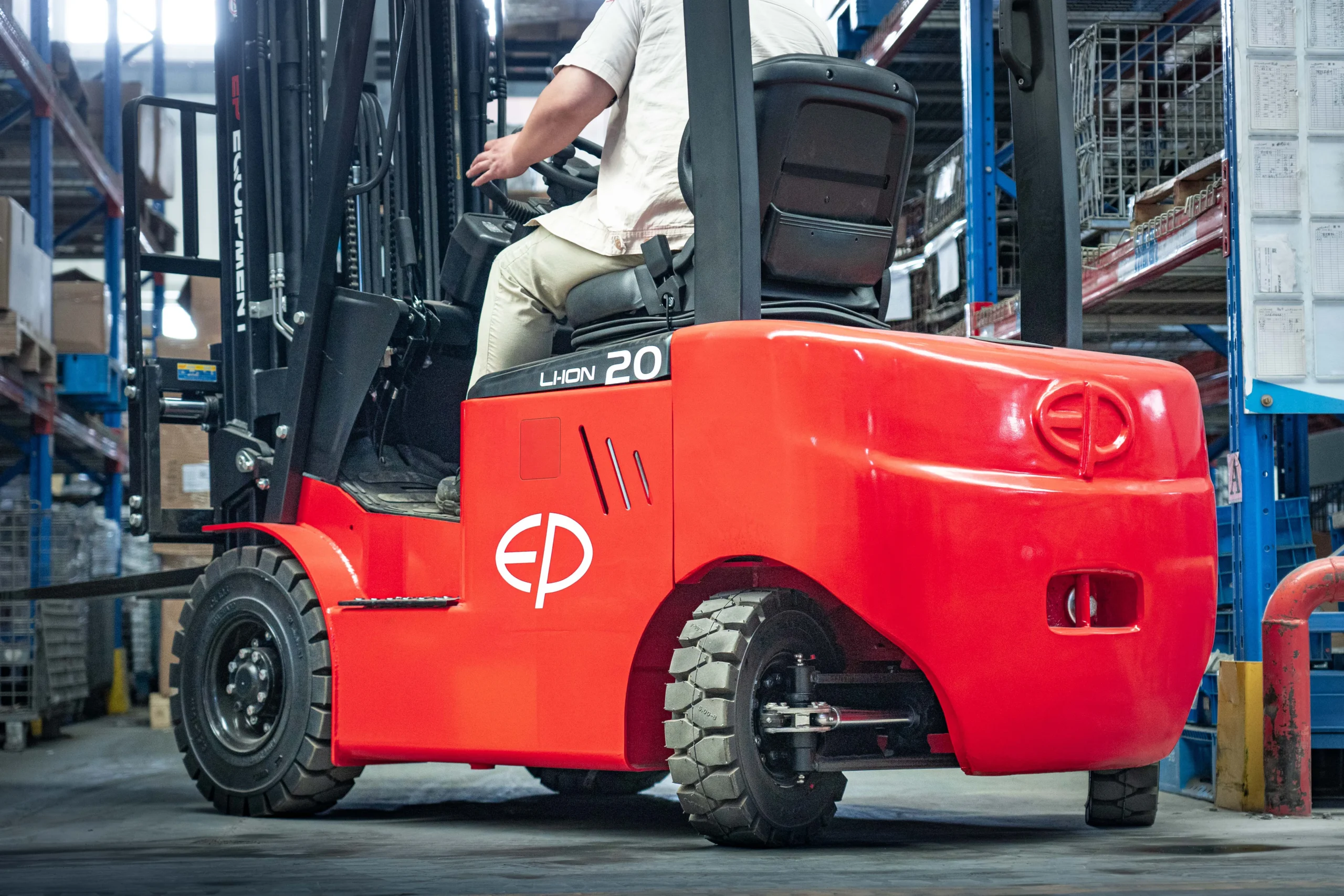 EP EFL201; yüksek yerden açıklığı, büyük lastikleri ve suya dayanıklı tasarımı sayesinde hem depo içinde hem de dış saha koşullarında güvenle çalışır.