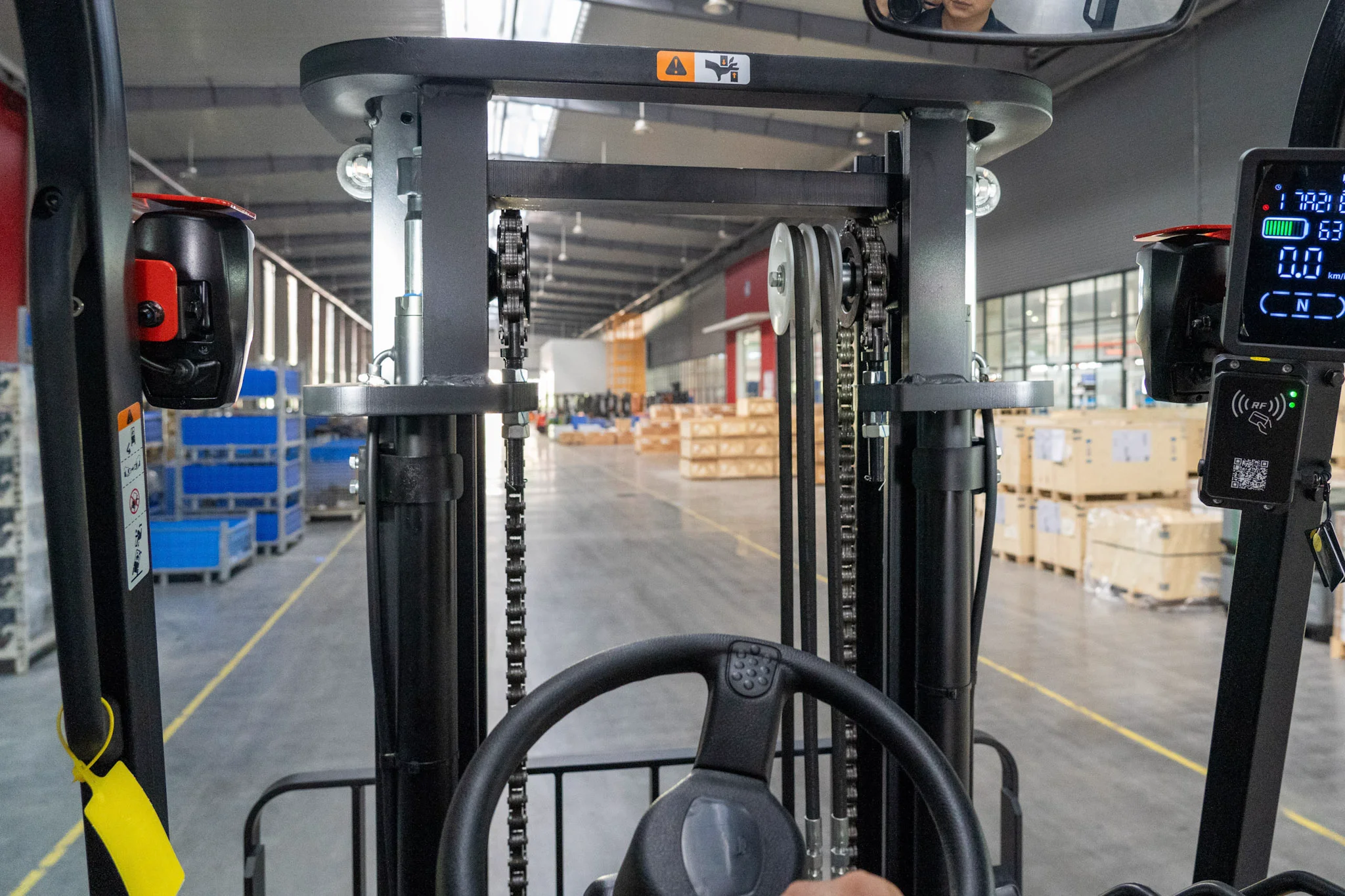 Triplex mast seçenekleriyle 4.800 mm ve 6.000 mm kaldırma yüksekliğine kadar uyum sağlayan yapı, yüksek raflı depo sistemlerinde verimli istifleme imkânı sunar.