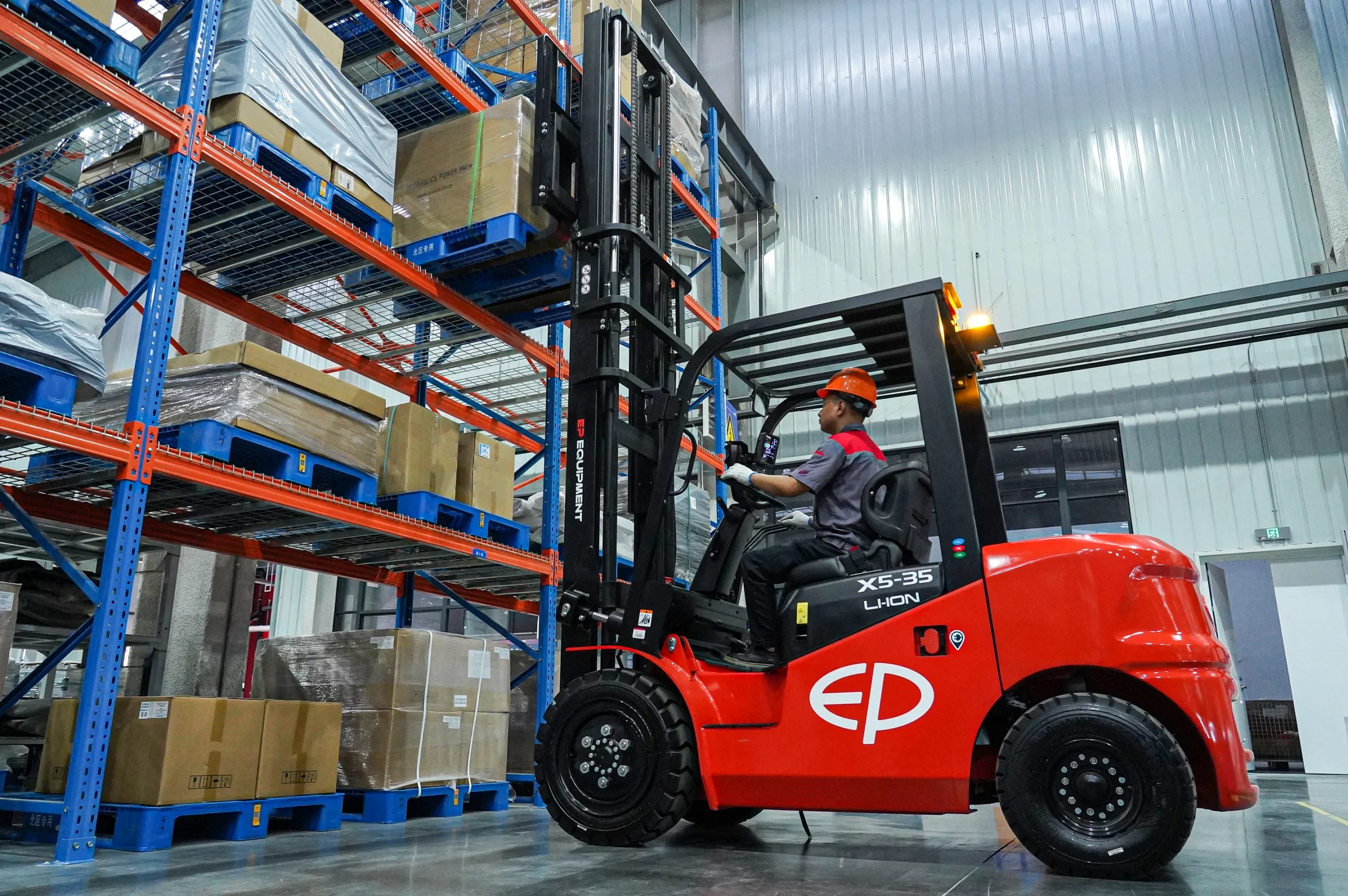 EP EFL382X5, 3.8 ton taşıma kapasitesi ve 80V 560Ah modüler Li-ion bataryasıyla ağır hizmet operasyonlarında dizel forklift performansını sıfır emisyonla sunan güçlü bir elektrikli forklift çözümüdür.